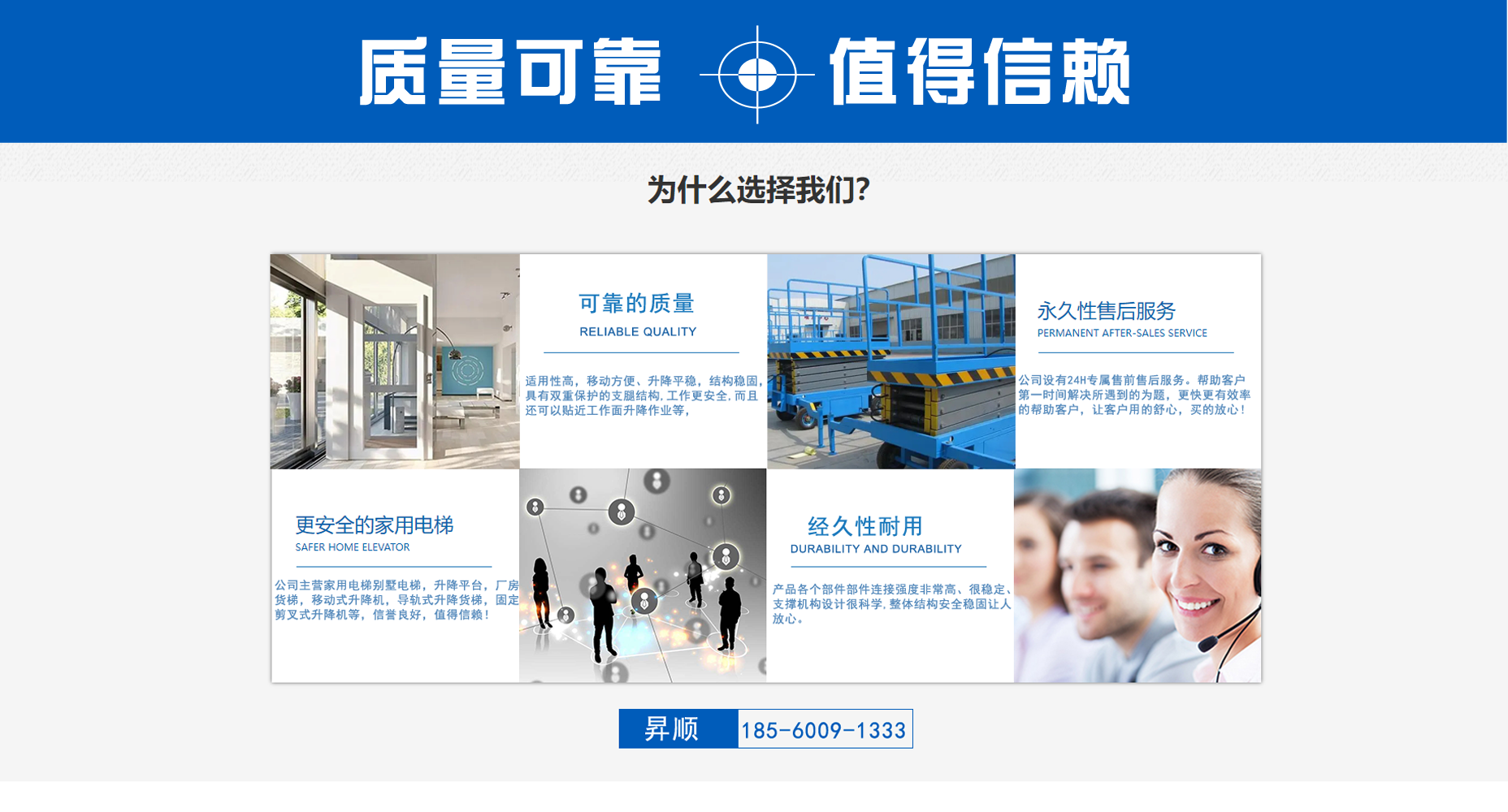 山東昇順液壓升降機(jī)械有限公司是一家主營(yíng)家用電梯,別墅電梯,升降平臺(tái),廠房貨梯,移動(dòng)式升降機(jī),導(dǎo)軌式升降貨梯,固定剪叉式升降機(jī)等產(chǎn)品企業(yè),質(zhì)量可靠,值得信賴。  用戶至上,以用戶為中心”是公司永遠(yuǎn)堅(jiān)持的服務(wù)宗旨,贏得用戶的贊許是我們的榮譽(yù),及時(shí)滿足用戶的需求,是我們公司的愿望。長(zhǎng)期以來,公司員工以優(yōu)質(zhì)的服務(wù),取悅于用戶,以誠(chéng)信的言行取信于用戶,得到了用戶們的好評(píng)。我們期待著與您更加愉快的合作!公司的發(fā)展,離不開社會(huì)的大力支持,在社會(huì)的支持和幫助下,我們正昂首闊步邁向未來!  我們的經(jīng)營(yíng)方針是:以質(zhì)量求生存,以產(chǎn)品求發(fā)展,以信譽(yù)保合作,以服務(wù)贏客戶。  本公司對(duì)產(chǎn)品質(zhì)量和各項(xiàng)服務(wù)恪守合同承諾,并愿與新老客戶精誠(chéng)合作,共創(chuàng)未來。  公司精神:創(chuàng)新是主題,超越是不懈的追求。  公司宗旨:信譽(yù)保證,誠(chéng)信為本。  我們會(huì)以合理的價(jià)格,良好的信譽(yù),雄厚的實(shí)力,優(yōu)質(zhì)的產(chǎn)品,最周到的服務(wù),服務(wù)于廣大新老客戶!...